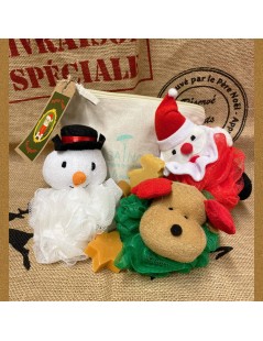 Une pochette ludique "P'tit Bazar" estampillée Casa Nature, en coton labellisé Fairtrade, avec 3 savons sujets de noël de 20 gr et une fleur de douche spéciale Noël, les enfants iront avec plaisir à la douche !!!